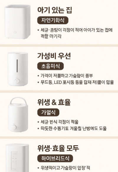 가정환경, 사용 목적, 관리 가능성에 따라 아래처럼 선택하면 좋아요.- 아이 있는 집 → 자연기화식 / 가열식